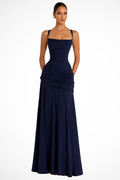 This Women's Elegant Ruched A-Line Maxi Dress features a sophisticated square neckline with wide shoulder straps and a fitted bodice enhanced by ruched detailing. The silhouette is tailored to contour the upper body, flowing into a gracefully flared A-line skirt that elegantly reaches the floor, making it perfect for formal events and wedding guest attire.